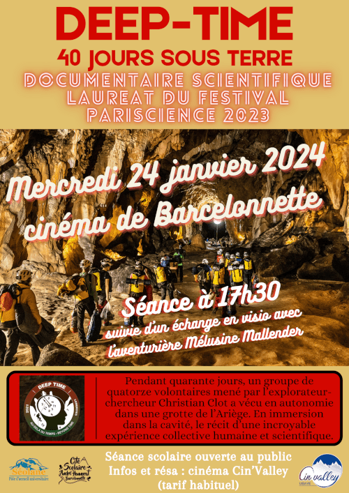 Projection-débat scolaires et grand-public au cinéma de Barcelonnette – DEEP-TIME 40 jours hors du temps, en présence – en visio – de la coréalisatrice du film et exploratrice Mélusine Mallender – Janvier 2024