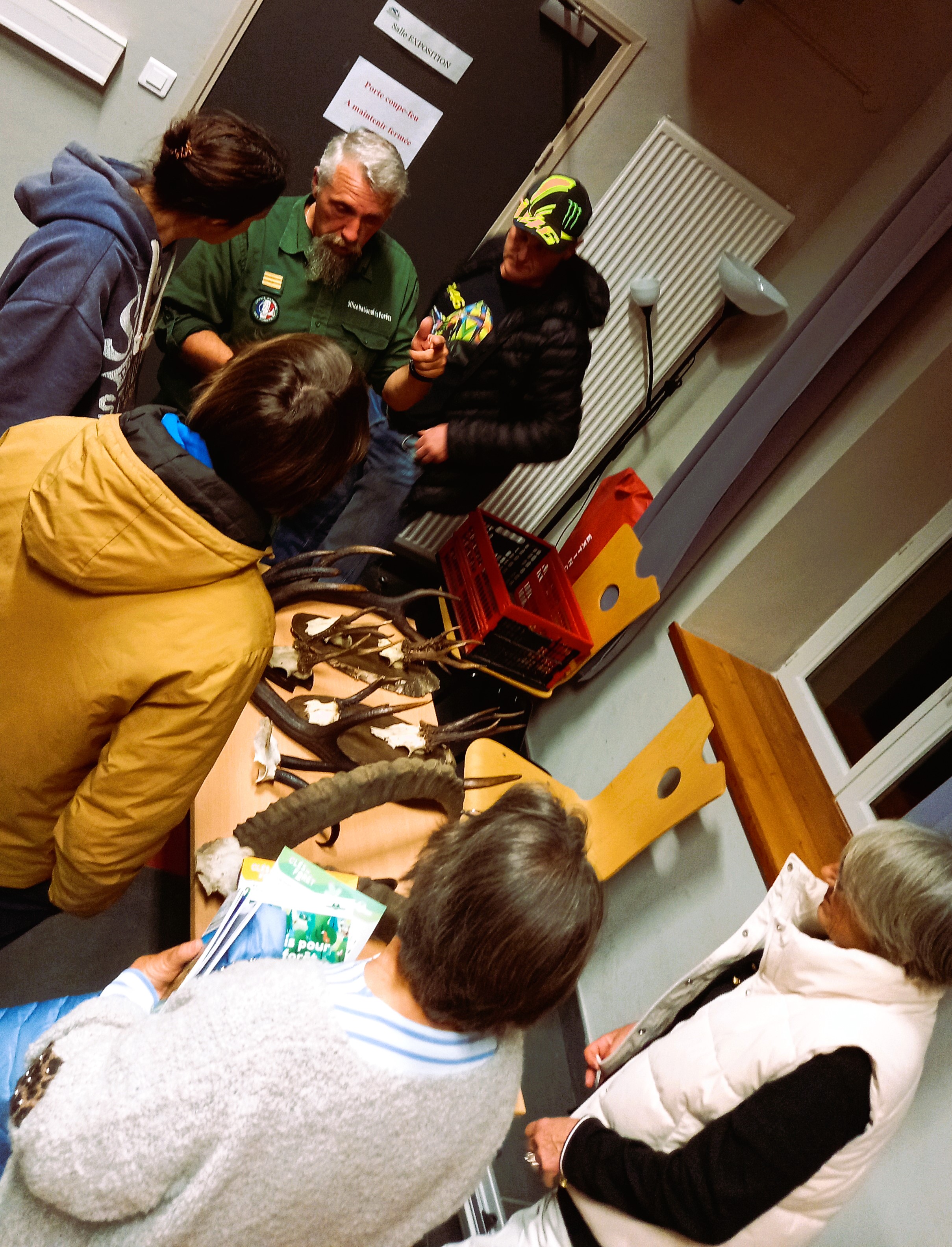 En fin de séance questions/réponses, le public venu nombreux a pu observer et manipuler bois et cornes et repartir avec des fiches pratiques et de « bonnes pratiques » en forêt : clés de détermination des arbres (à télécharger ici), des empreintes (à télécharger là) et la charte du promeneur (à télécharger par ici), des documents récemment édités par l’ONF.
