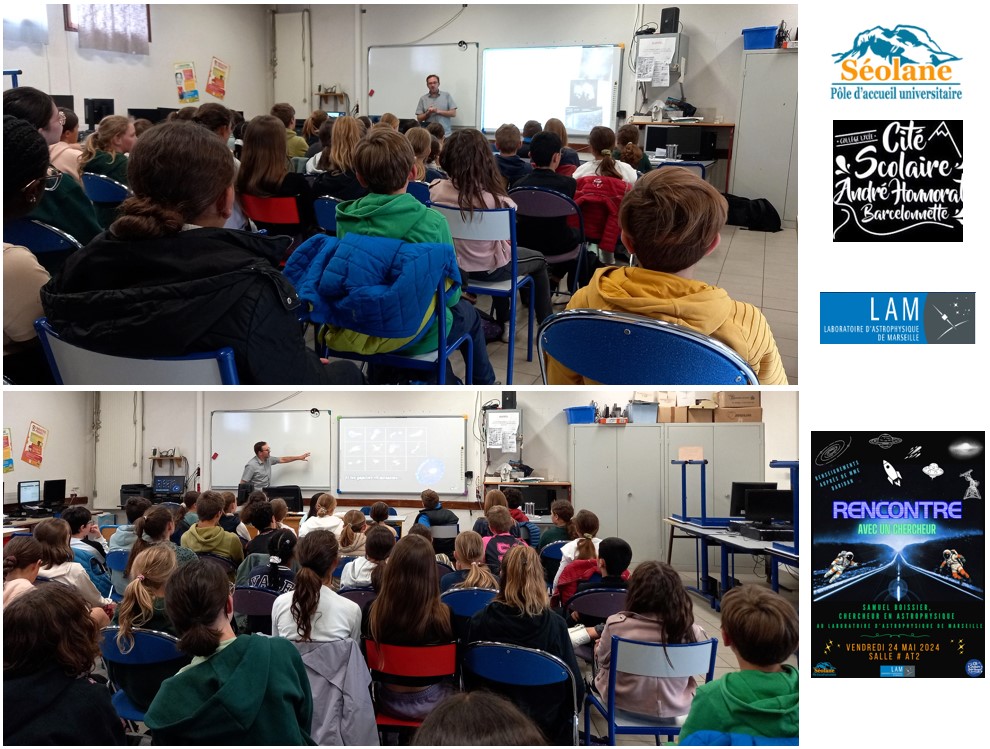 Il a tout d‘abord rencontré les élèves de la cité scolaire, pour 2 séances organisées en groupes selon le niveau des élèves. Quelques 80 collégiens et lycéens ont pu rencontrer Samuel qui leur a d’abord présenté le métier de chercheur, puis les différents métiers possibles dans un laboratoire d’astrophysique, mais aussi les études pour pouvoir accéder à ces carrières, et tout cela bien sûr sur fond d’astrophysique ! Un temps de questions-réponses et de présentation des thématiques du laboratoire qui s’est prolongé sur le temps de la récréation avec quelques jeunes passionnés !!