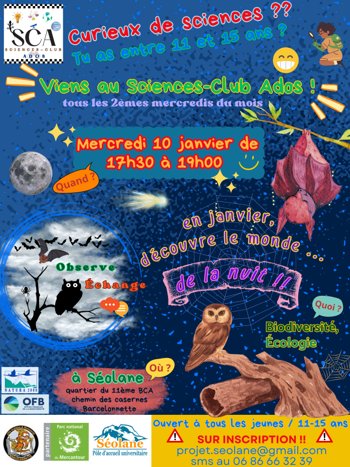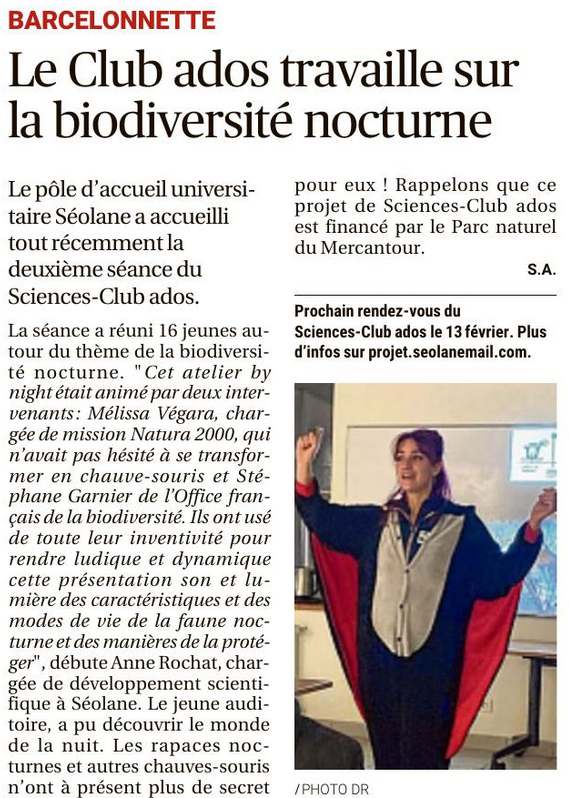 Une très belle séance « by night » pour la deuxième rencontre du Sciences-Club des ados à Séolane mercredi 10 janvier dernier. Nos intervenants, Mélissa (Natura2000, CCVUSP) et Stéphane (Office Français de la Biodiversité), ont usé de toute leur inventivité pour rendre ludique, dynamique et féerique cette présentation son et lumière des caractéristiques et des modes de vie de la faune nocturne et de comment les protéger.