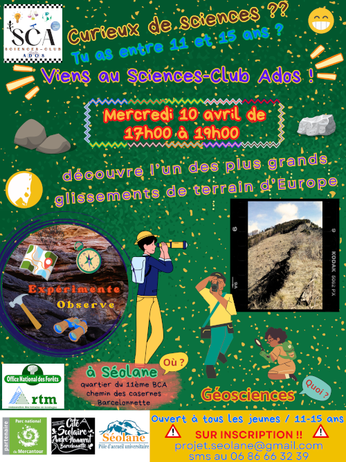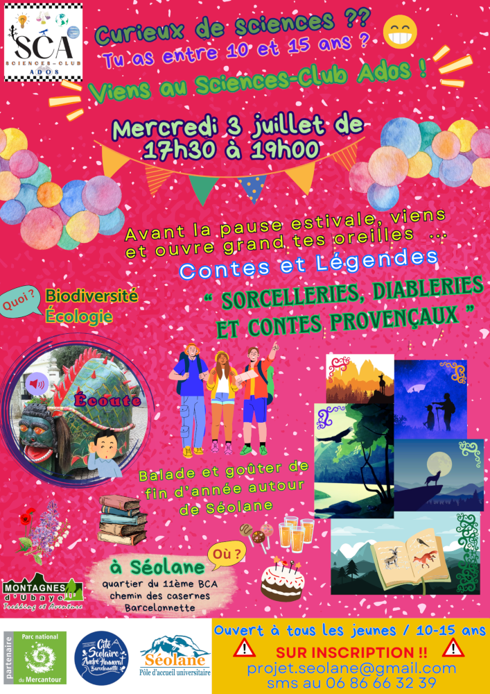 Le Sciences-Club Ados propose, pour finir l’année scolaire en beauté, une séance Contes & Légendes avec petite balade autour de Séolane et goûter offert.