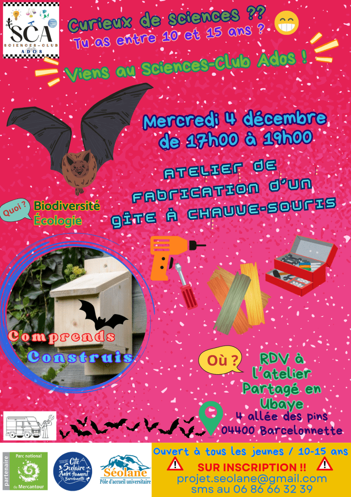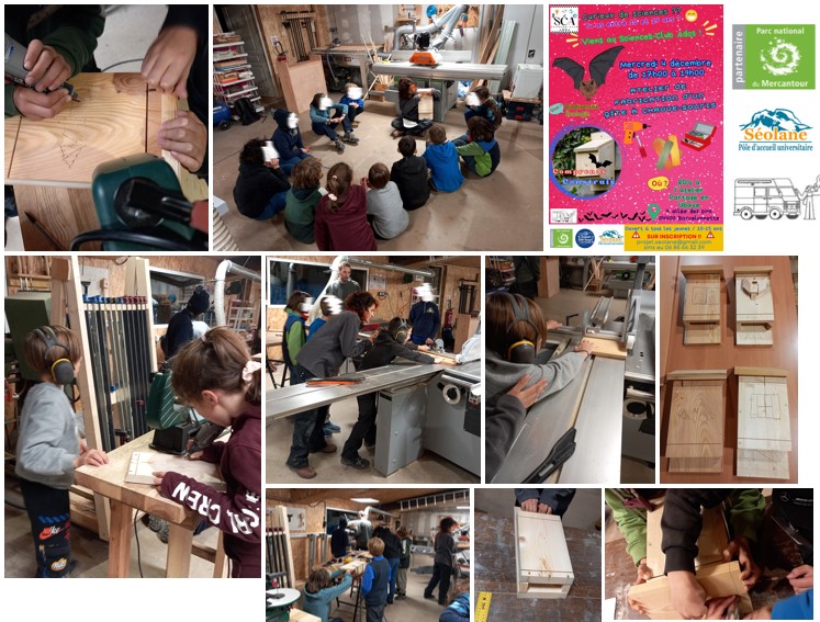 Ce mercredi, une séance un peu rallongée pour les jeunes du SCA, de façon à pouvoir finaliser leurs gîtes à chauve-souris ! Diane, menuisière, a encadré les jeunes dans son atelier à Barcelonnette, pour leur faire construire, par petits groupes, 4 gîtes en bois imputrescible, que nous irons installer au printemps, pour accueillir ces chers Chiroptères.